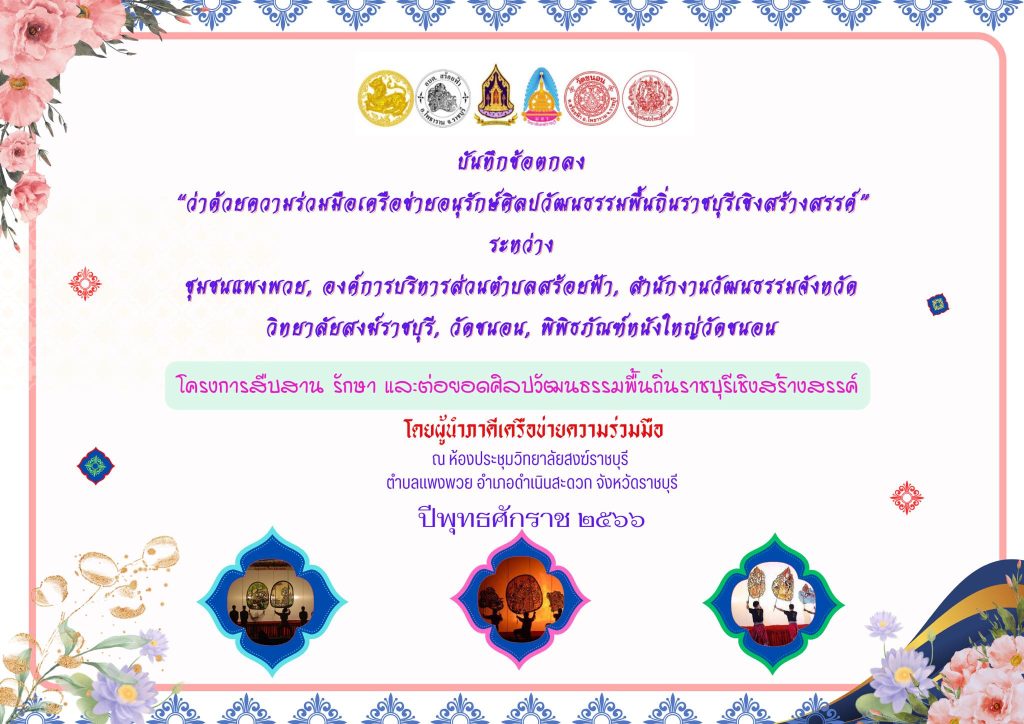 วิทยาลัยสงฆ์ราชบุรี ได้จัดพิธีลงนามข้อตกลงความร่วมมือ(MOU) โดยผู้นำภาคีเครือข่ายความร่วมมือ และได้มอบตัวหนังใหญ่ที่ใช้ในเรื่องพระมหาชนก