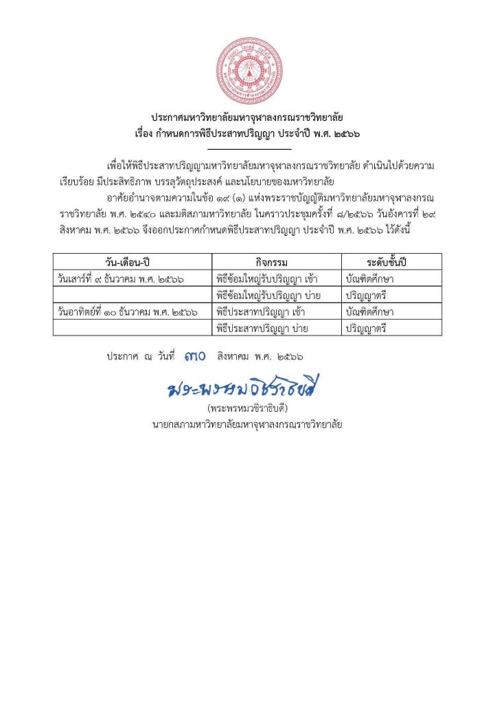 ประกาศกำหนดพิธีประสาทปริญญา ประจำปี พ.ศ. ๒๕๖๖ วันเสาร์ที่ ๙ ธันวาคม พ.ศ. ๒๕๖๖ พิธีซ้อมใหญ่รับปริญญา วันอาทิตย์ที่ ๑๐ ธันวาคม พ.ศ. ๒๕๖๖ พิธีประสาทปริญญา